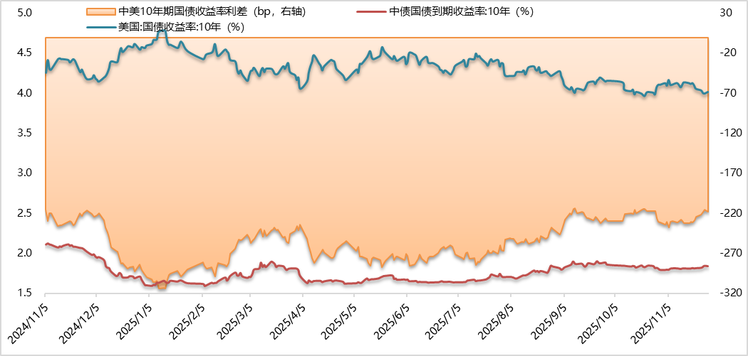 2025年11月25日当周,10年期美债收益率下行。具体来看:周一,美联储理事沃勒与旧金山联储行长戴利均表态支持12月降息,提升市场对年底降息的预期,10年期美债收益率与前一周五(11月21日)相比下行2bp至4.04%;周二,哈塞特有望出任新美联储主席的消息令市场继续提高了对未来降息的预期,10年期美债收益率由此继续下行3bp至4.01%;周三,美联储褐皮书显示近几周美国整体消费支出进一步下降,10年期美债收益率由此下行1bp至4.00%;周四为感恩节假期,美债市场休市一日;周五,因芝商所技术故障和缺乏重大催化剂,市场交投低迷,10年期美债收益率由此上行2bp至4.02%,与前一周五(11月21日)相比下行4bp。